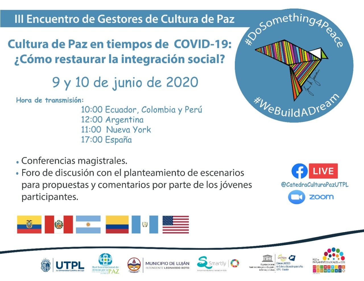 El evento tendrá lugar los días 9 y 10 de junio, se desarrollará vía on-line y en una de sus jornadas contará con la participación de: el Intendente Leonardo Boto y el Rector de la Basílica Nuestra Señora de Luján, Padre Lucas García, como oradores; el Secretario de Culturas y Turismo, Nicolás Capelli, como moderador; los representantes de “Jóvenes por la Paz” en Argentina, Florencia Shqueitzer y Juan José Araya, como oradores; y la Directora en Localización de Políticas Públicas en ODS-Buenos Aires, Evangelina Colli, que compartirá las conclusiones finales del panel.